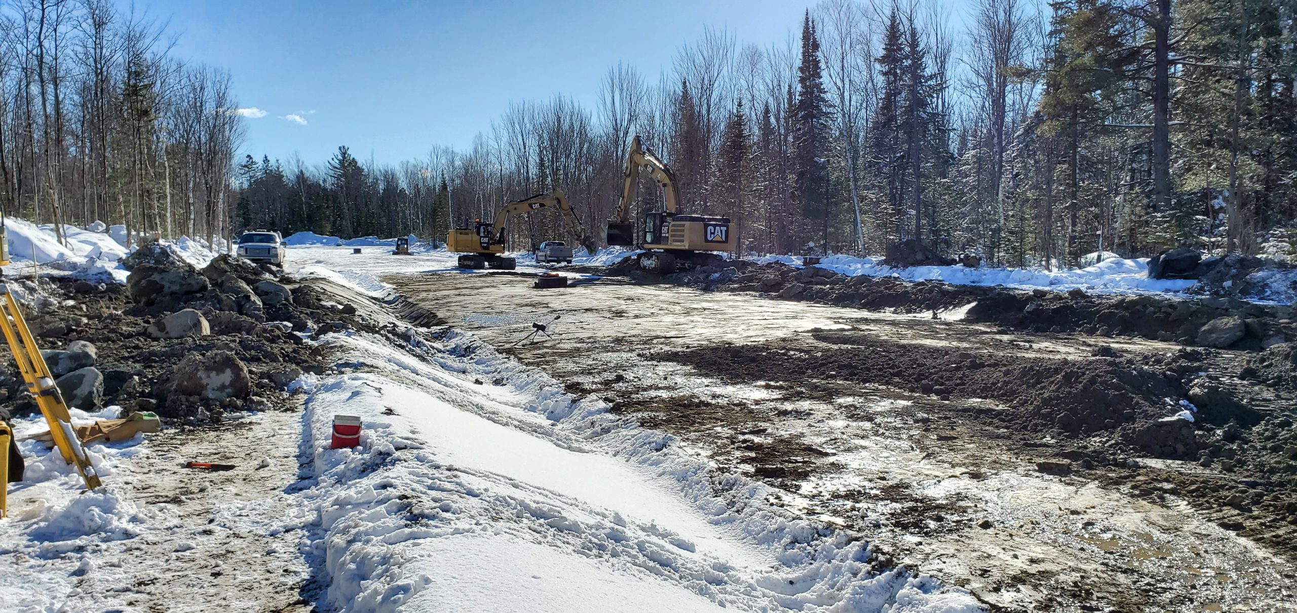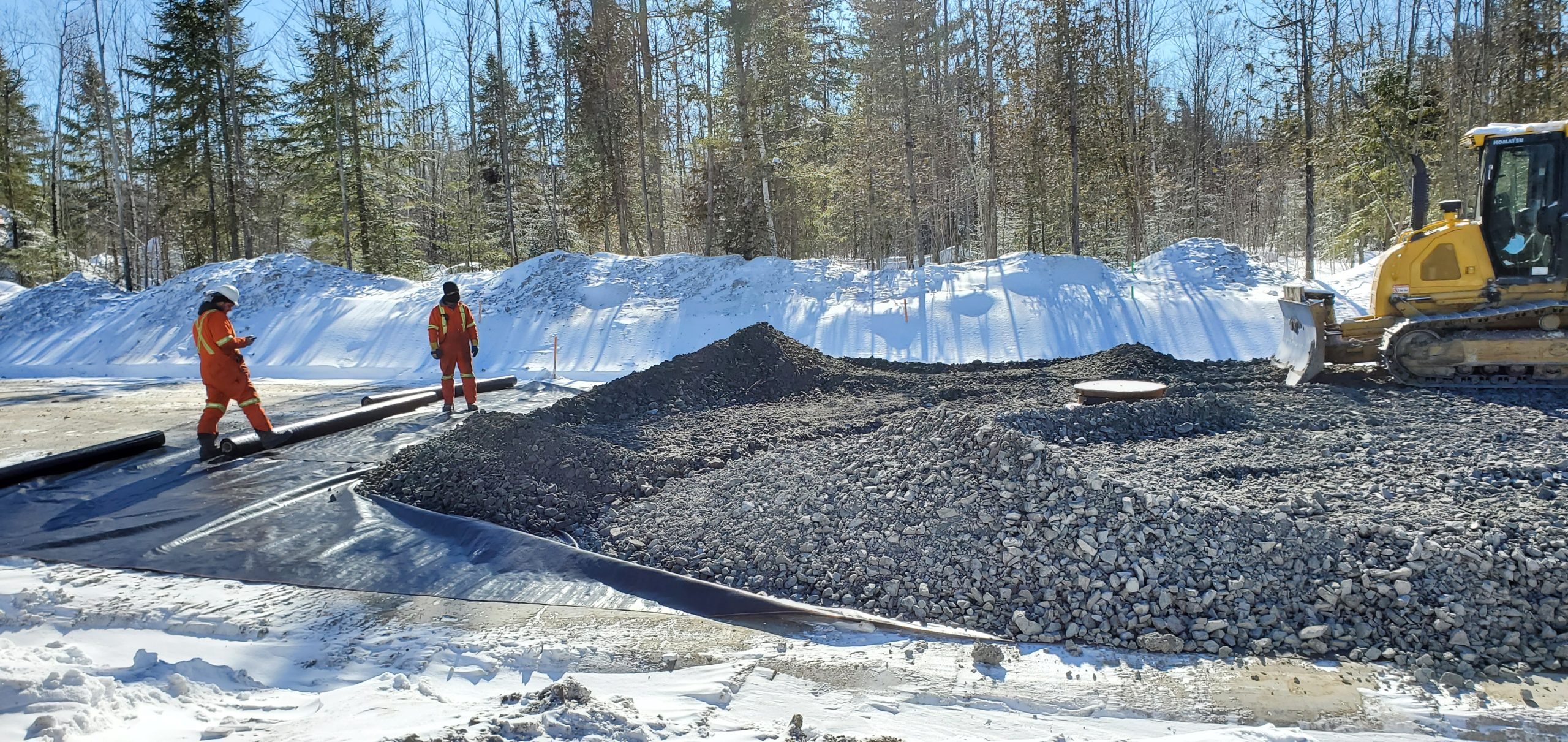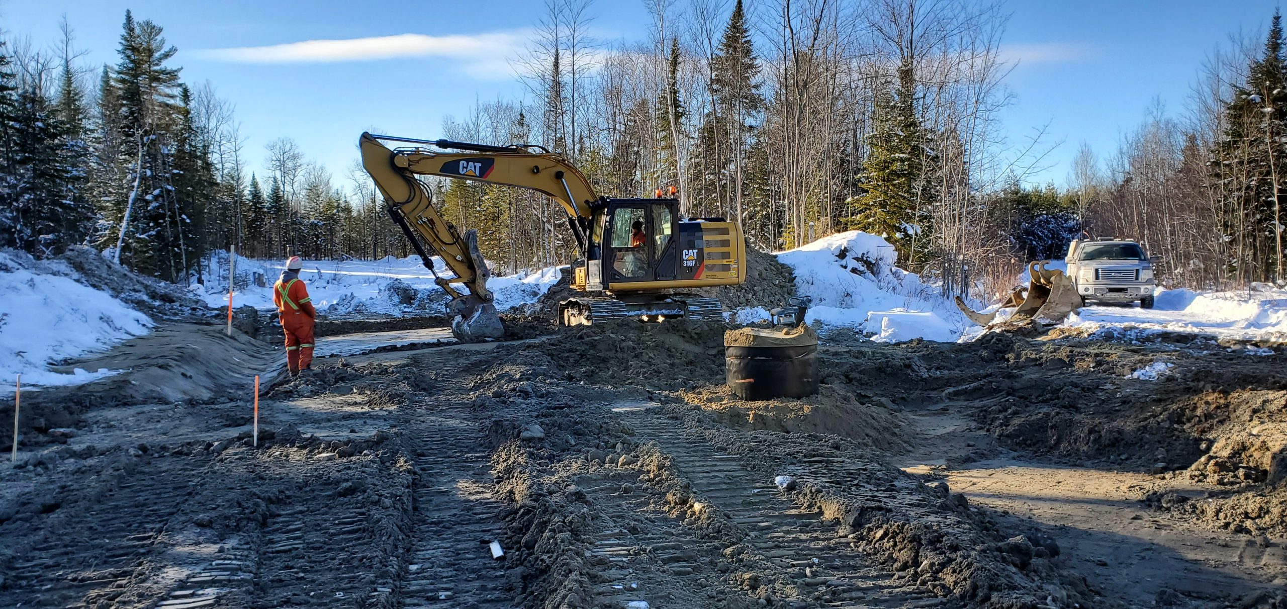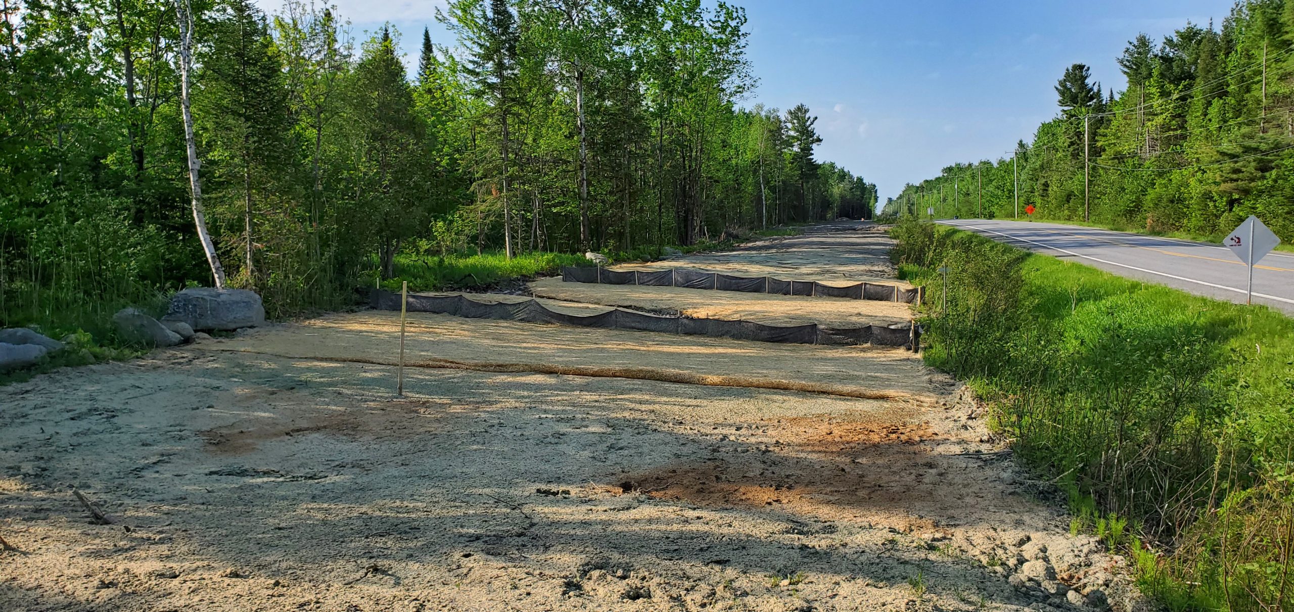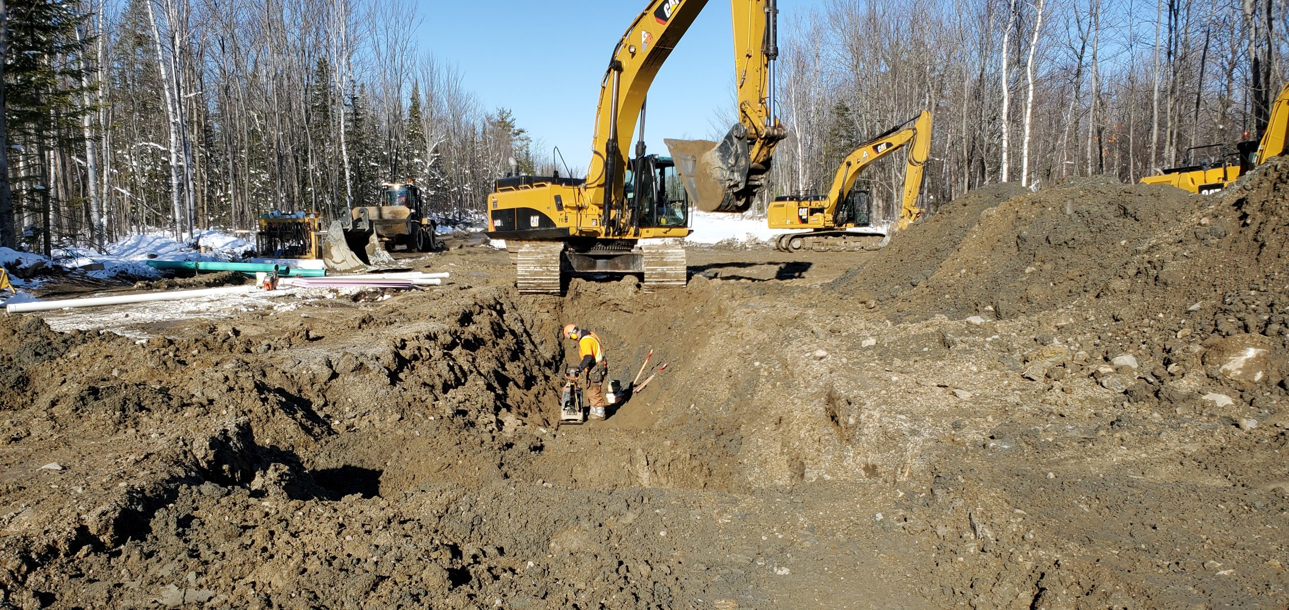 Le site du projet se situe sur un terrain majoritairement plat, ponctué de milieux humides, impliquant la présence de sols localement incompétents. Les principaux travaux d’excavation ont été réalisés en période hivernale, nécessitant une attention particulière à la gestion des matériaux. Une surveillance rigoureuse a ainsi été assurée afin d’identifier les sols devant être disposés et de prévenir la remise en place de sols gelés ou de qualité inadéquate dans les infrastructures.